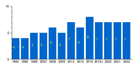 | בחירות | מנהיגים | קולות | אחוז | מושבים | +/- | קואליציה/אופוזיציה |