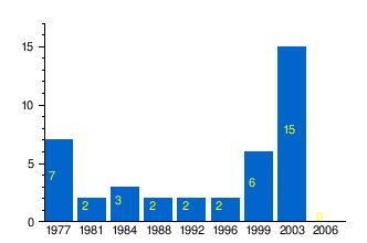 | בחירות | מנהיג | קולות | אחוז | מושבים | +/- | קואליציה/אופוזיציה |