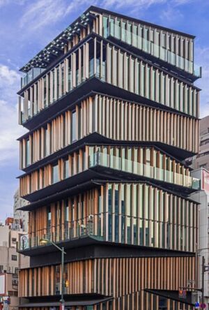 קומה תכנן את המבנה כ"ערימה של מבני עץ יפנים מסורתיים שנערמו זה על גבי זה". כל קומה בנפרד מזכירה בצורתה מבנה יפני מסורתי אך עם פרשנות עכשווית. שלד הבניין הוא מפלדה אך החלק החיצוני מבליט את העץ. רפפות העץ ניצבים במאונך אל מנת להדגיש את המישורים של הגגות והרצפות. אופן הההנחה של הבתים אחד על גבי השני בזוויות יצר חללים מפתיעים בין הקומות, השונים מאדריכלות השכבות הקונבנציונלית. קומה השתמש בחללים הללו עבור כל חדרי המכונות והציוד הטכני. "אנחנו רגילים מדי לרעיון שהרצפות צריכות להיות שטוחות, אבל אני מקווה שהצלחתי לעורר אנשים לחשוב מחדש על היחסים בין בניינים ורצפות" אמר קומה.[7]